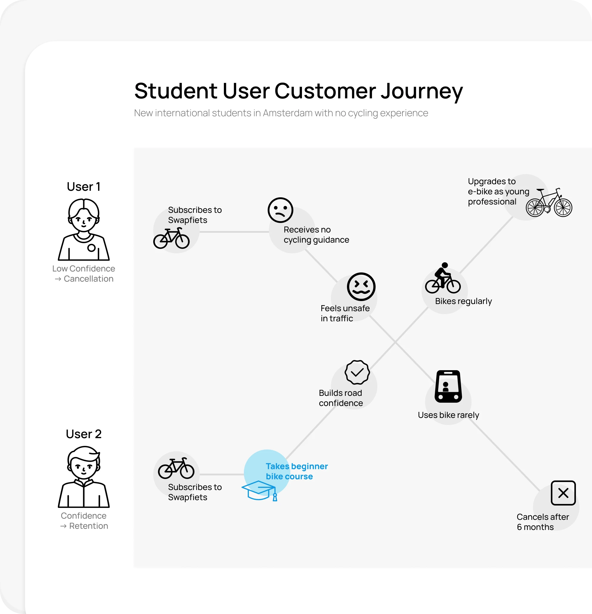 For this master’s project, I identified an opportunity within the Swapfiets ecosystem to educate newcomers on Amsterdam’s cycling rules to improve user experience while supporting business goals.