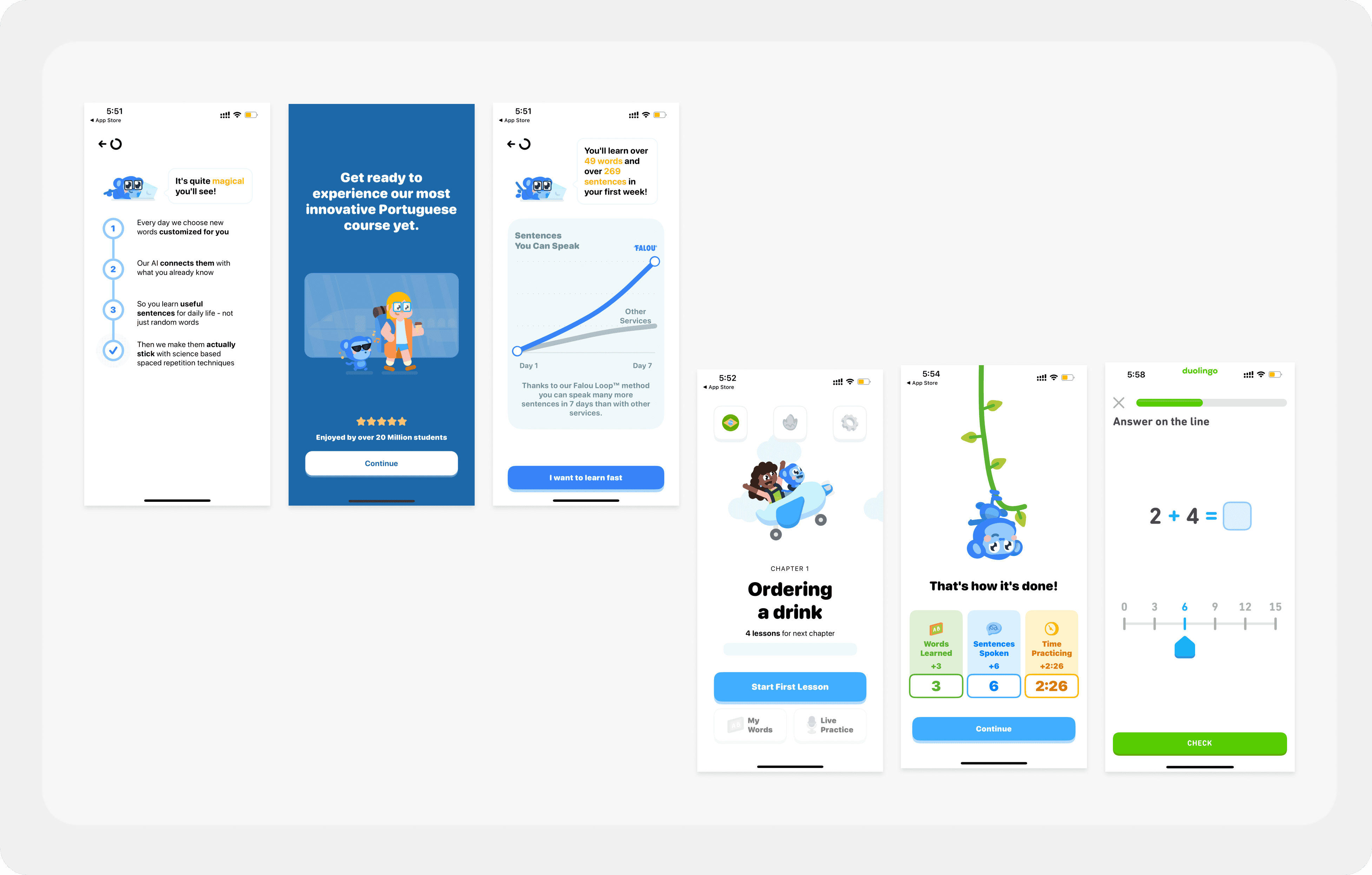 I drew inspiration from learning apps like Falou and Duolingo, prioritizing quick, effective learning. Research on how the brain processes text and visuals also helped guide the design.